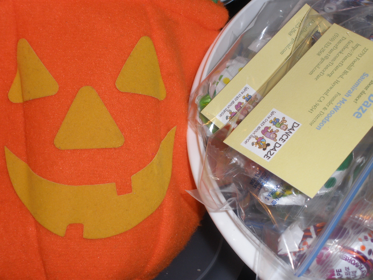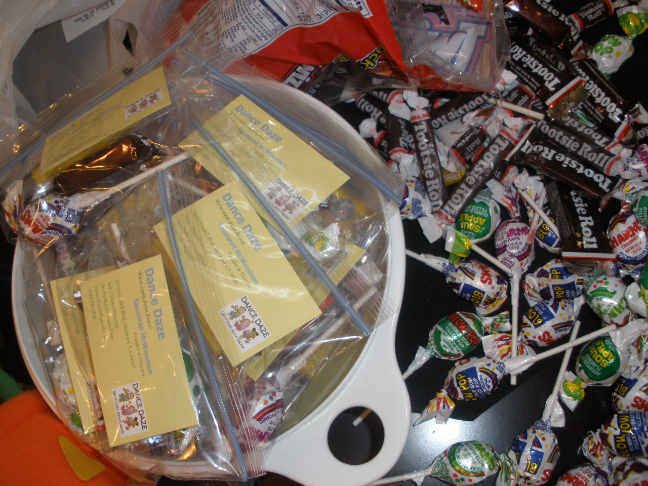 Because of this, I thought Halloween would be the perfect opportunity to both promote Dance Daze and encourage healthy eating! Last night, I gave out bags of fat-free mini pretzels to my trick-or-treaters, complete with my Dance Daze business cards attached!